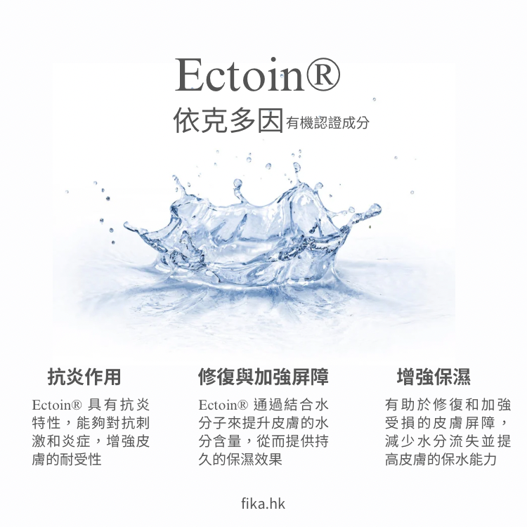 珍貴成分: 三重透明質酸天然防護因子 Ectoin 能迅速穩定膚況,舒緩環境帶來的刺激不適,同時強化肌膚屏障,維持健康平衡。